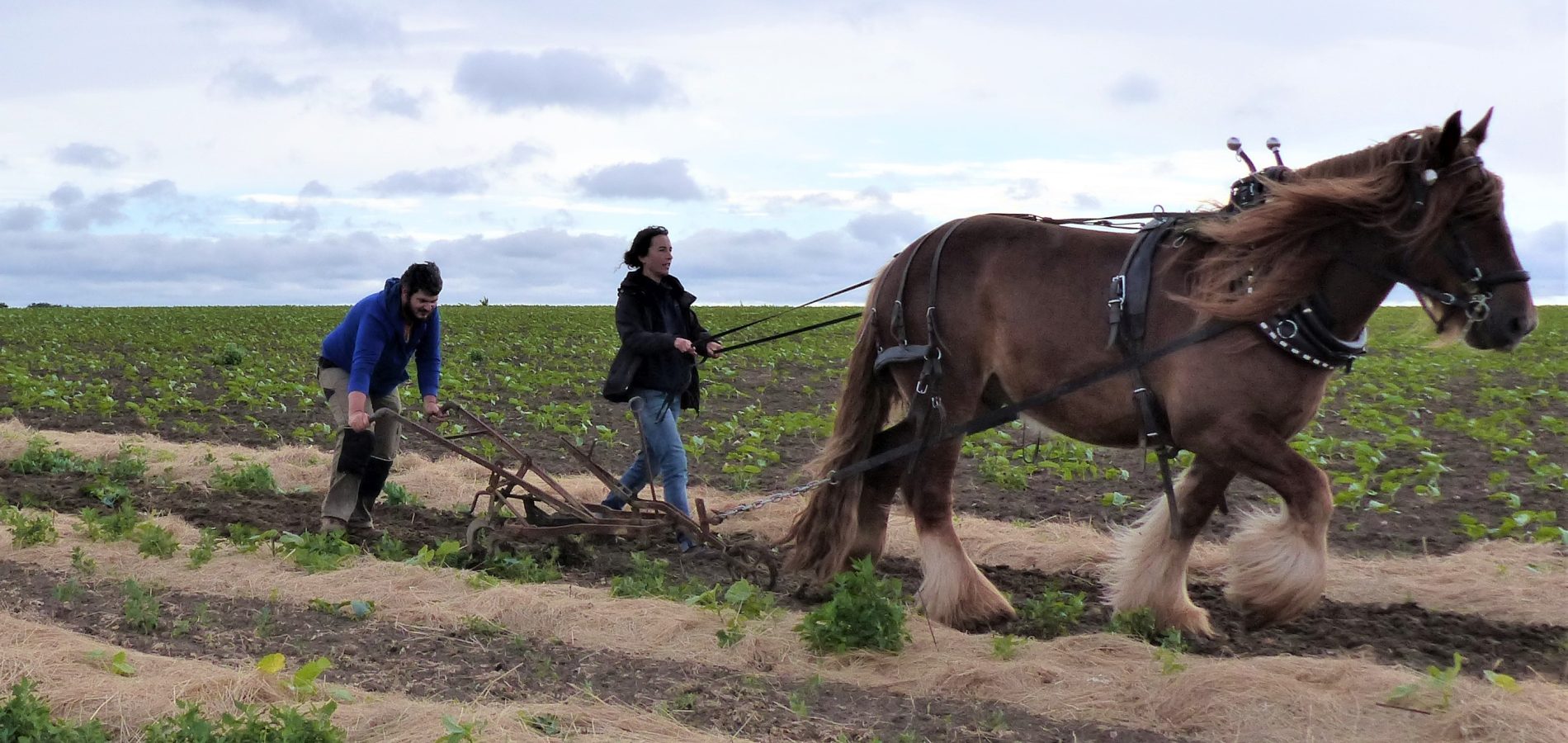 La traction animale a encore de beaux jours devant elle. C’était un réel plaisir d’accueillir Éole et Noémie dans le champ, et les courageux bénévoles ont pu profiter de quelques pauses pour admirer le travail de leur équipier du jour : un vrai travail d’équipe en effet, car Éole ne peut pas passer partout !