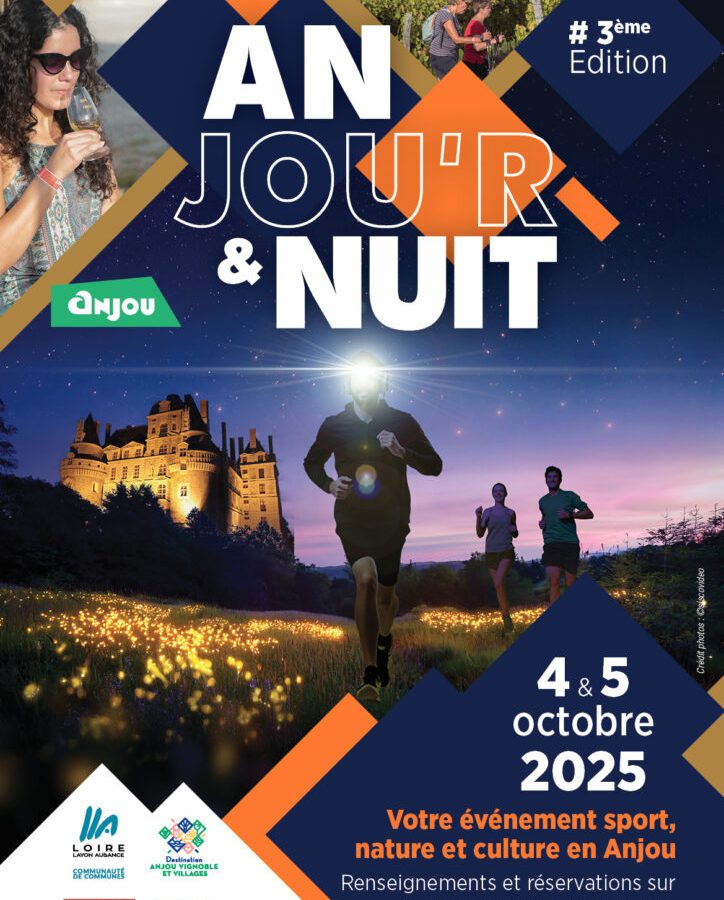 L’Office de Tourisme Anjou Vignoble et Villages organise, les 4 et 5 octobre prochains, Anjou’r & Nuit. Au cours de ces deux jours, cet événement sportif souhaite mettre en lumière le patrimoine et le savoir-faire local. Des trails, des randonnées pédestres, des visites patrimoniales, des activités œnologiques et gustatives et bien d’autres sont proposés tout au long de ces deux jours de festivités.