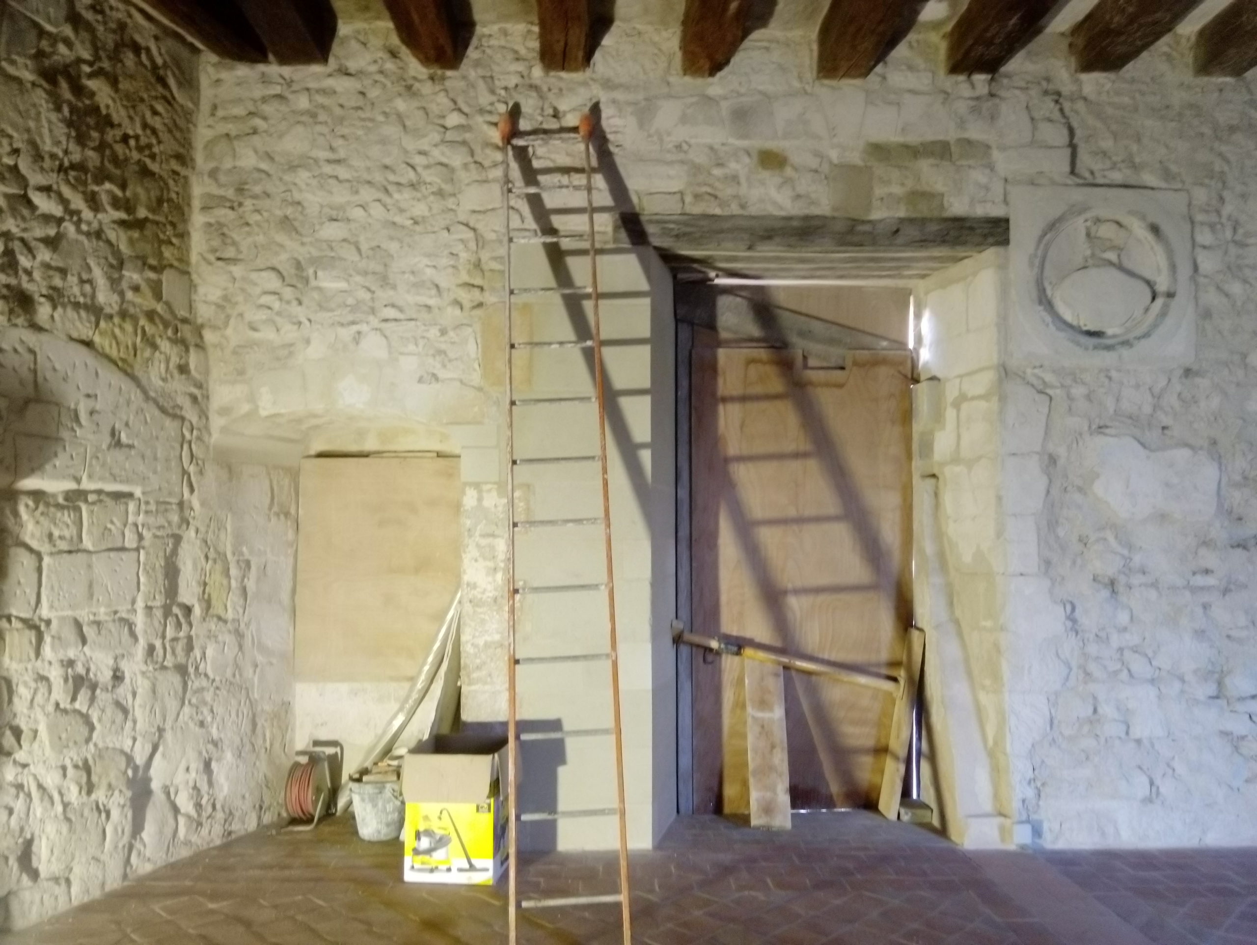 La largeur d’une porte a été réduite (elle avait été prévue pour faire passer des charrettes à partir du XVIIIème siècle) et ce sera la future entrée à la salle de la cheminée, avec une accessibilité pour les personnes à mobilité réduite. L’ensemble n’est pas encore terminé, mais c’est à présent au menuisier d’intervenir.