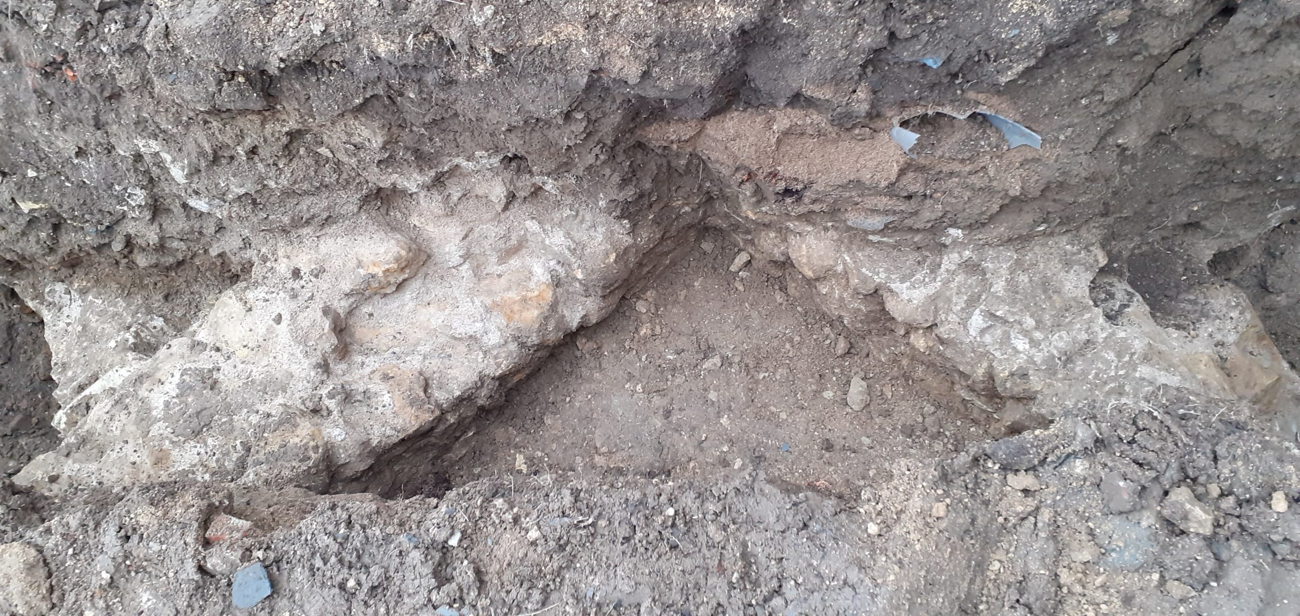 Les travaux prévus consistaient à creuser une partie du remblais XIXème afin notamment de dégager puis démurer une ancienne porte d’accès aux caves (au pied de la tour d’escalier Nord-Est). On voit bien sur la photo la partie du mur qui était à l’air libre et celle sous le remblais (marron).