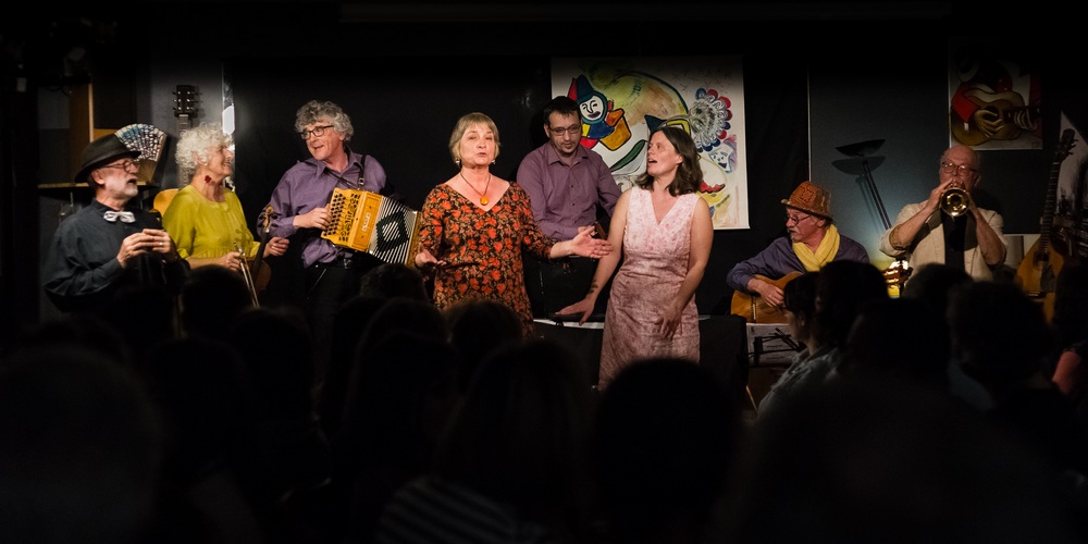 8 musicien-nes, également chanteuses et chanteurs composent le Grand Huit qui conjugue chanson française et musique trad.
